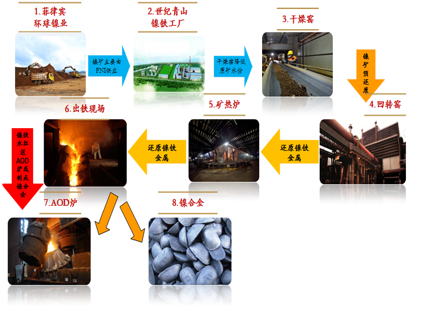 工藝流程 RKEF+AOD熱裝熱送一體化生產(chǎn)工藝,噸鋼節(jié)省電耗450kW·h