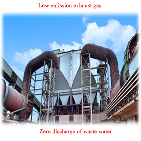 Exhaust: Carry out dedusting by adopting the method combining electrostatic precipitator and bag dust-cleaning. By using desulfuration within the kiln and limestone gypsum desulfurization technology, the discharge of dust, SO2 and NOx etc. is far below the local standard and industrial standard.